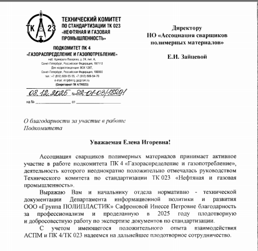 Подкомитет ПК 4 «Газораспределение и газопотребление» выражает благодарность Ассоциации СПМ в лице директора – Зайцевой Е.И. и заместителю начальника управления нормативно-технического обеспечения Дирекции маркетинга – Сафроновой И.П. за активную и добросовестную работу по экспертизе документов по стандартизации, проделанную в 2025 году.